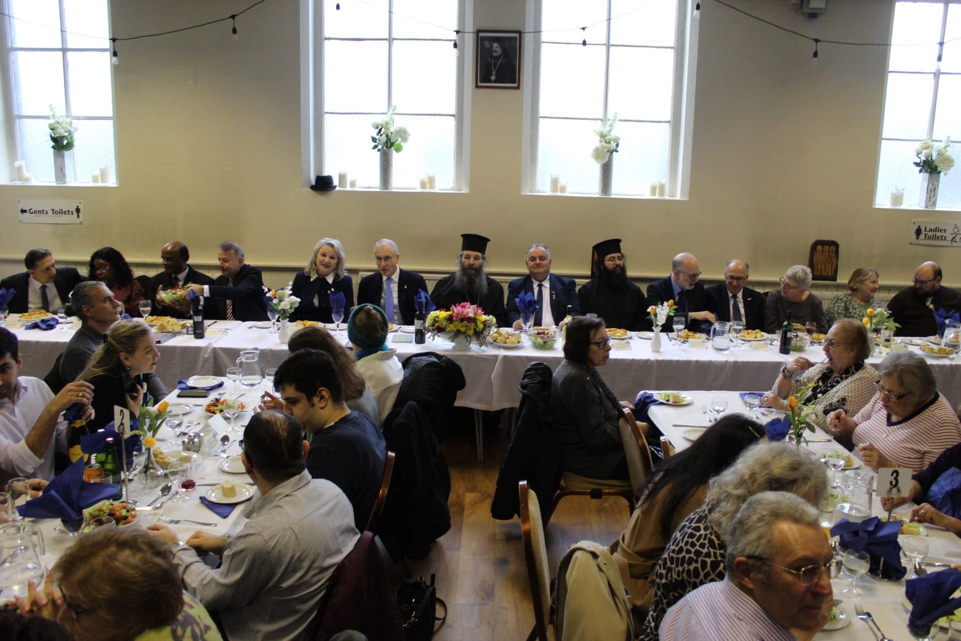 Μετά τη λειτουργία, πάνω από 160 καλεσμένοι απόλαυσαν ένα εορταστικό γεύμα δύο πιάτων που παραδόθηκε προς όλους στην αίθουσα της κοινότητας, το οποίο ετοίμασε και σερβίρε ο κ. Ιάσων Καβάζης με την υποστήριξη της κας Αντιγόνης (Νόνης) Χρίστου, Προέδρου της Βοηθητικής Αδελφότητας Γυναικών και της ομάδας εθελοντών τους. Το γεύμα περιέλαβε σολωμό, πατάτες, σαλάτα και παραδοσιακά ελληνικά επιδόρπια — μια ζεστή και χαρούμενη συγκέντρωση για όλους.
