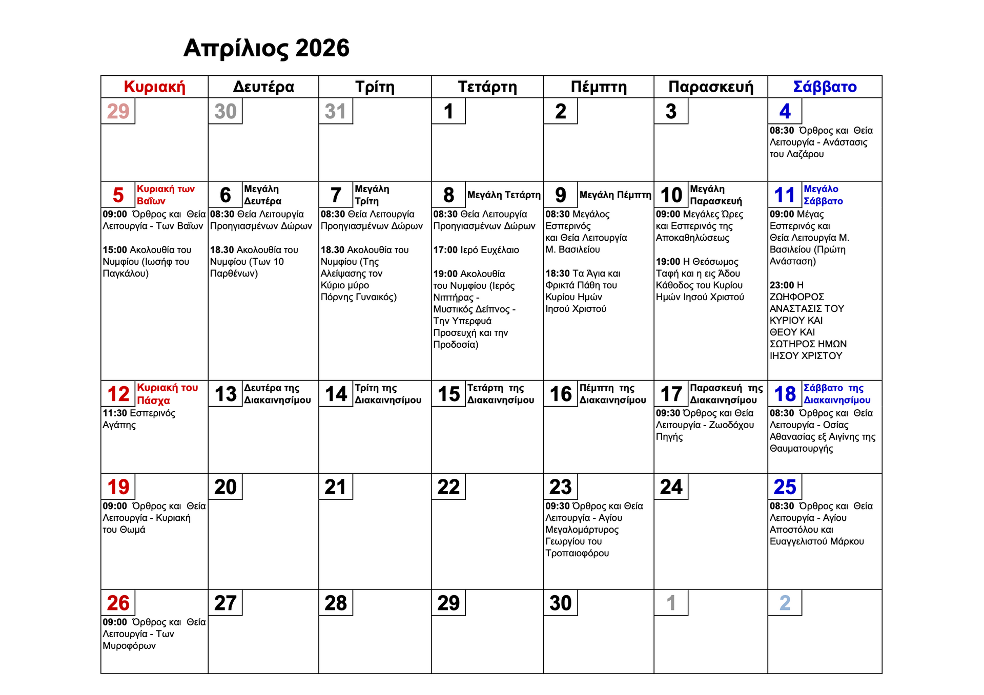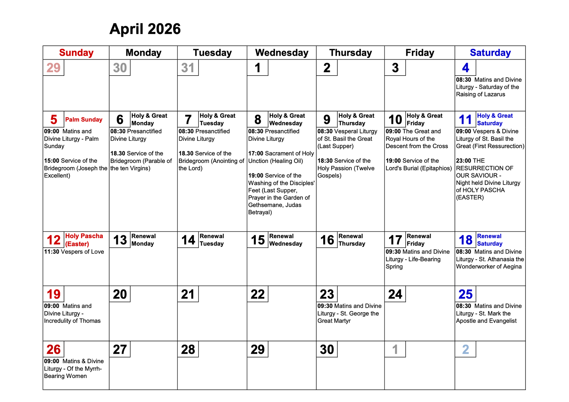 Right below, details on sacraments, services and related activities on offer, all held at Church, unless otherwise specified.